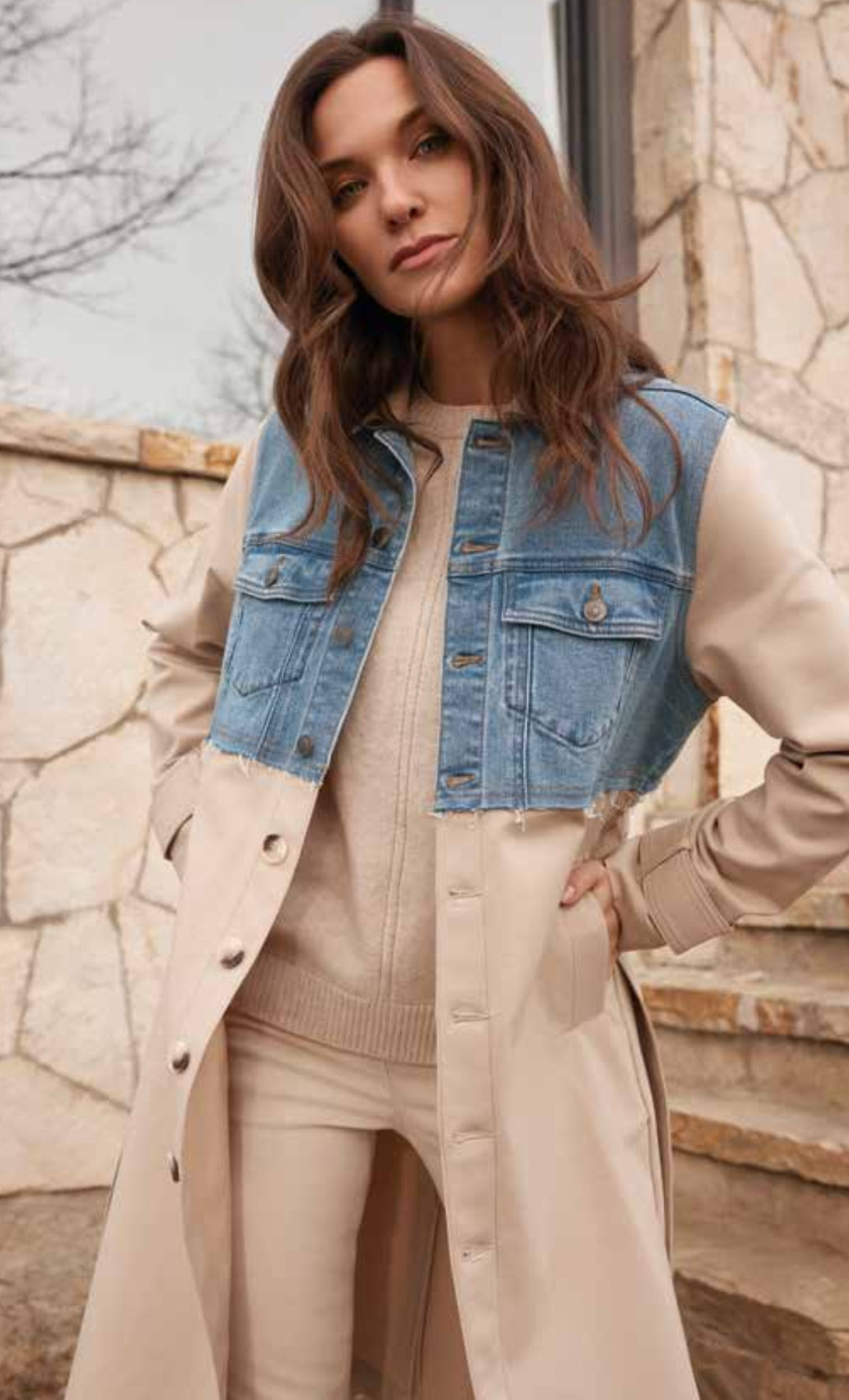 This Cashew Woven Jacket features elegant denim accents that add a refined contrast to its textured fabric. Designed as a trench-style jacket, it combines classic tailoring with modern materials, offering a sophisticated yet approachable look. The denim details highlight the jacket’s structure, making it a versatile piece perfect for both casual and polished ensembles.